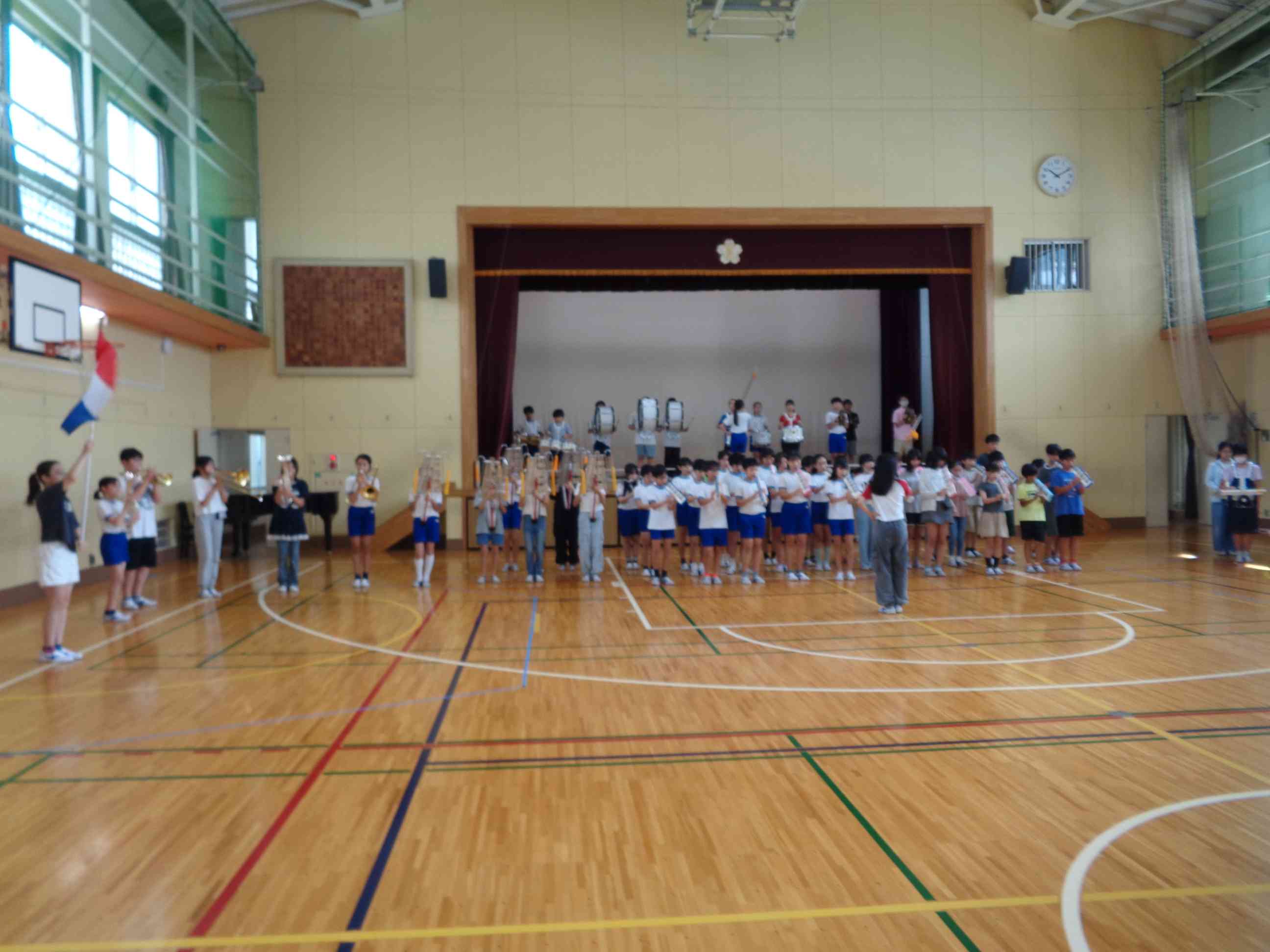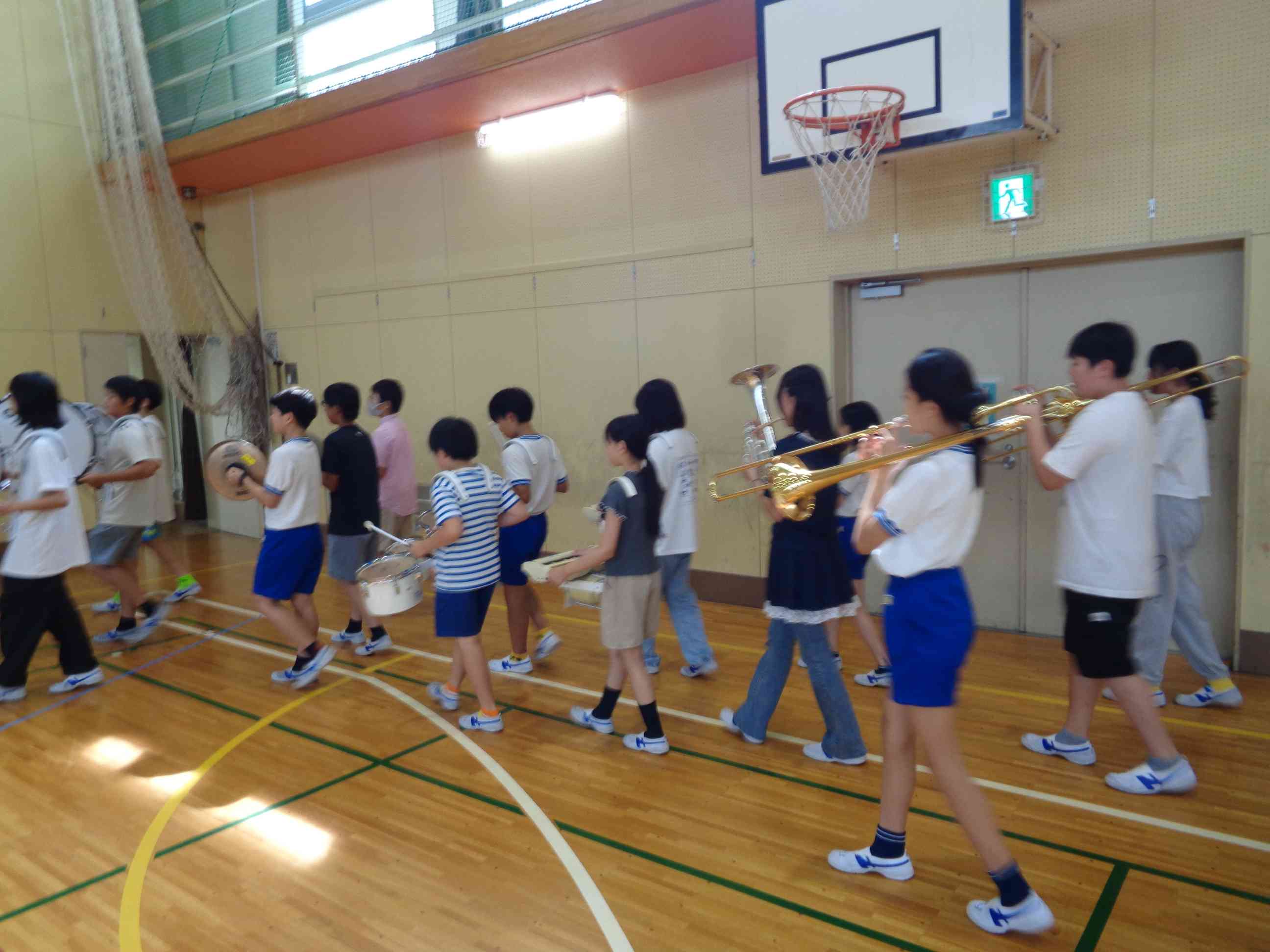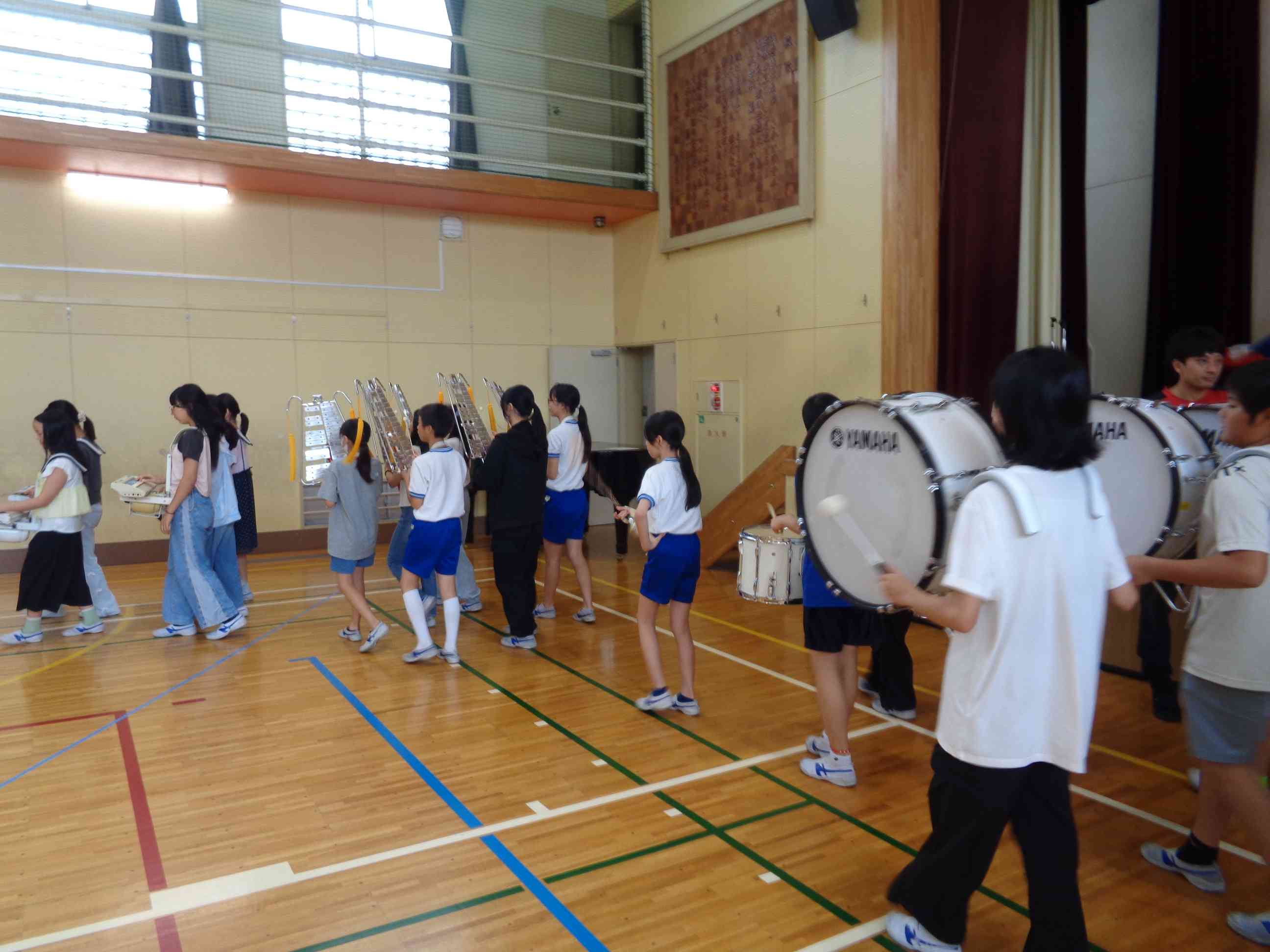 9月28日(日)に実施される、大島パレードに向けて、体育館での鼓笛練習が始まりました。鼓笛隊の練習自体は、昨年度の11月から行っていますが、歩きながらの演奏は初めてです。初回の練習では、音を合わせることに苦労していました。 9月26日(金)には、下級生や6年生の保護者の方に音楽朝会でも演奏をお披露目します。良い演奏を聴かせてくれることを楽しみにしています。